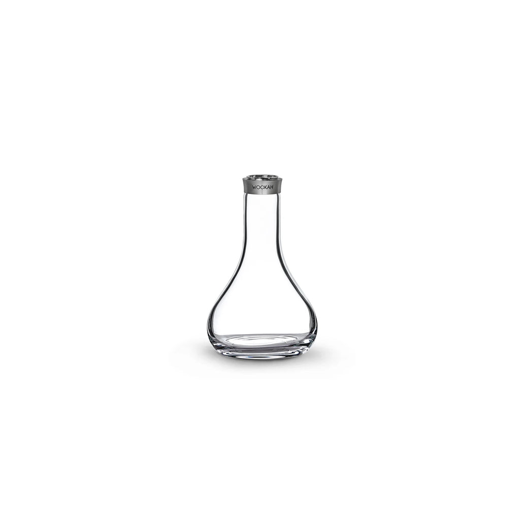 WOOKAH Vase Smooth. It is made of glass that was handmade during the blowing process. It includes 1.4301 (V2A) stainless steel thread with WOOKAH engravement. The distinctness of the Smooth vase derives from the fact that its cover is completely smooth, clearly transparent and lacks cuts. As a rare occurrence, the material can include a subtle feature: a thread-like streak within the vase.